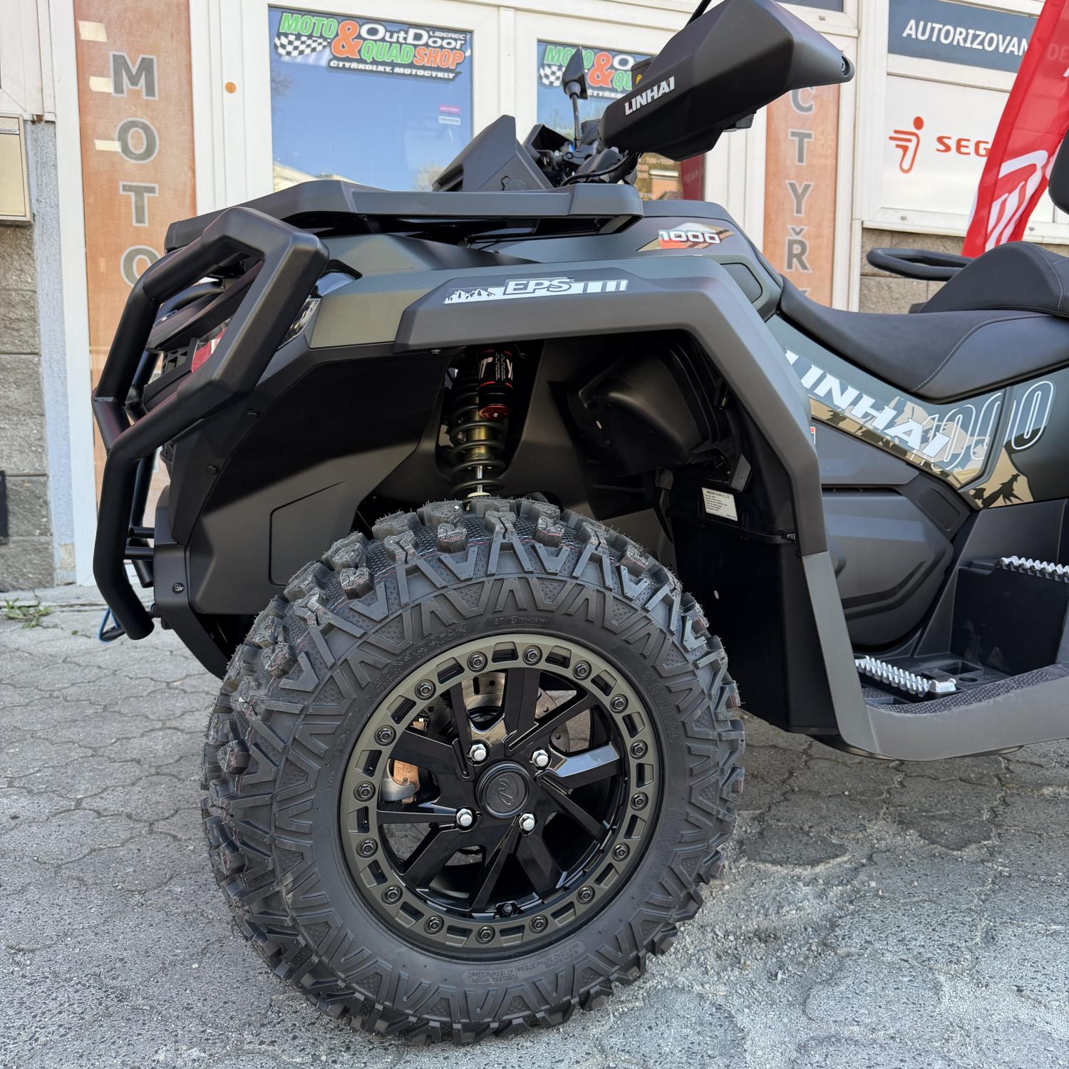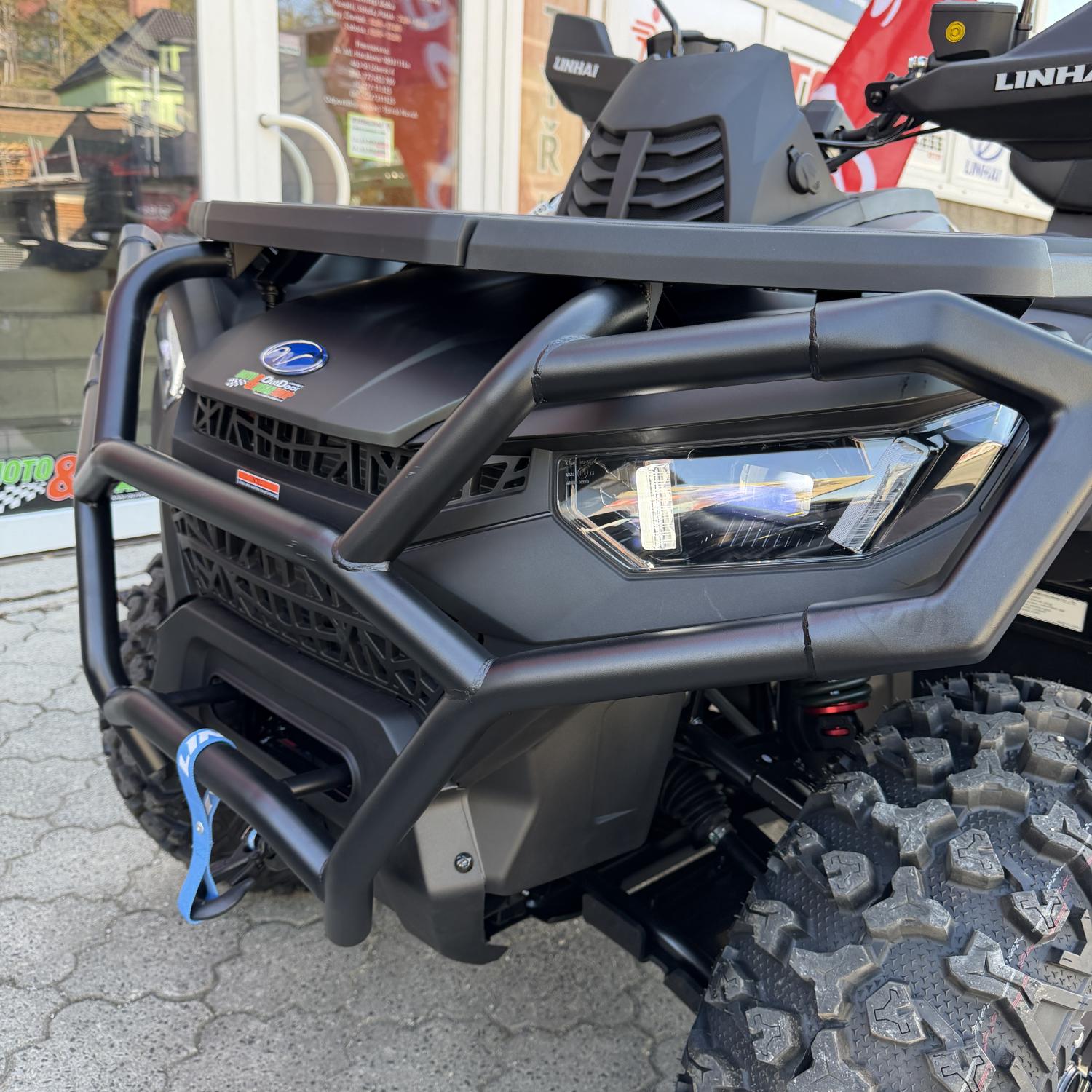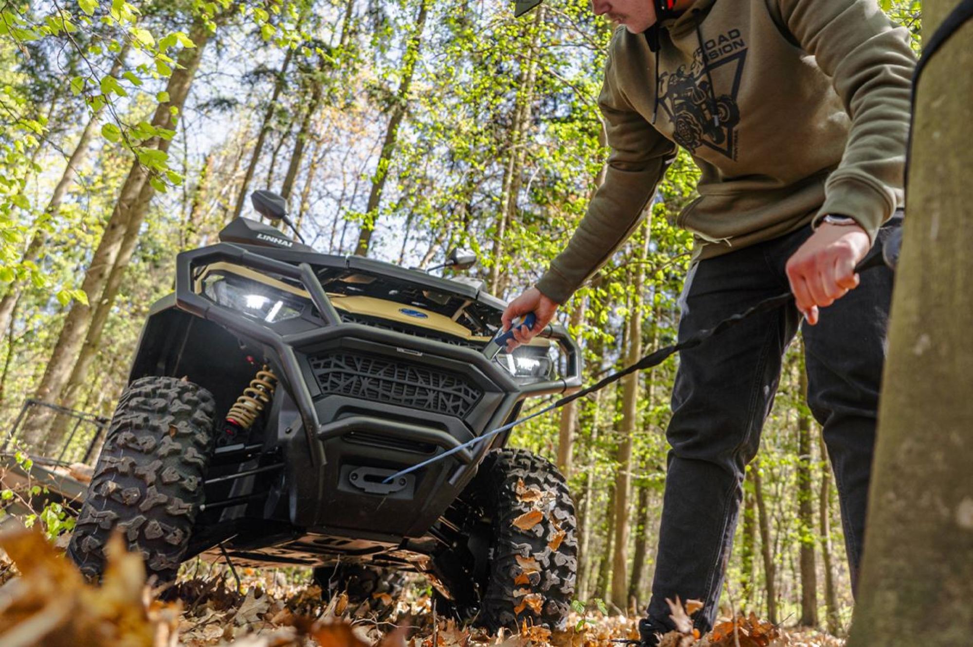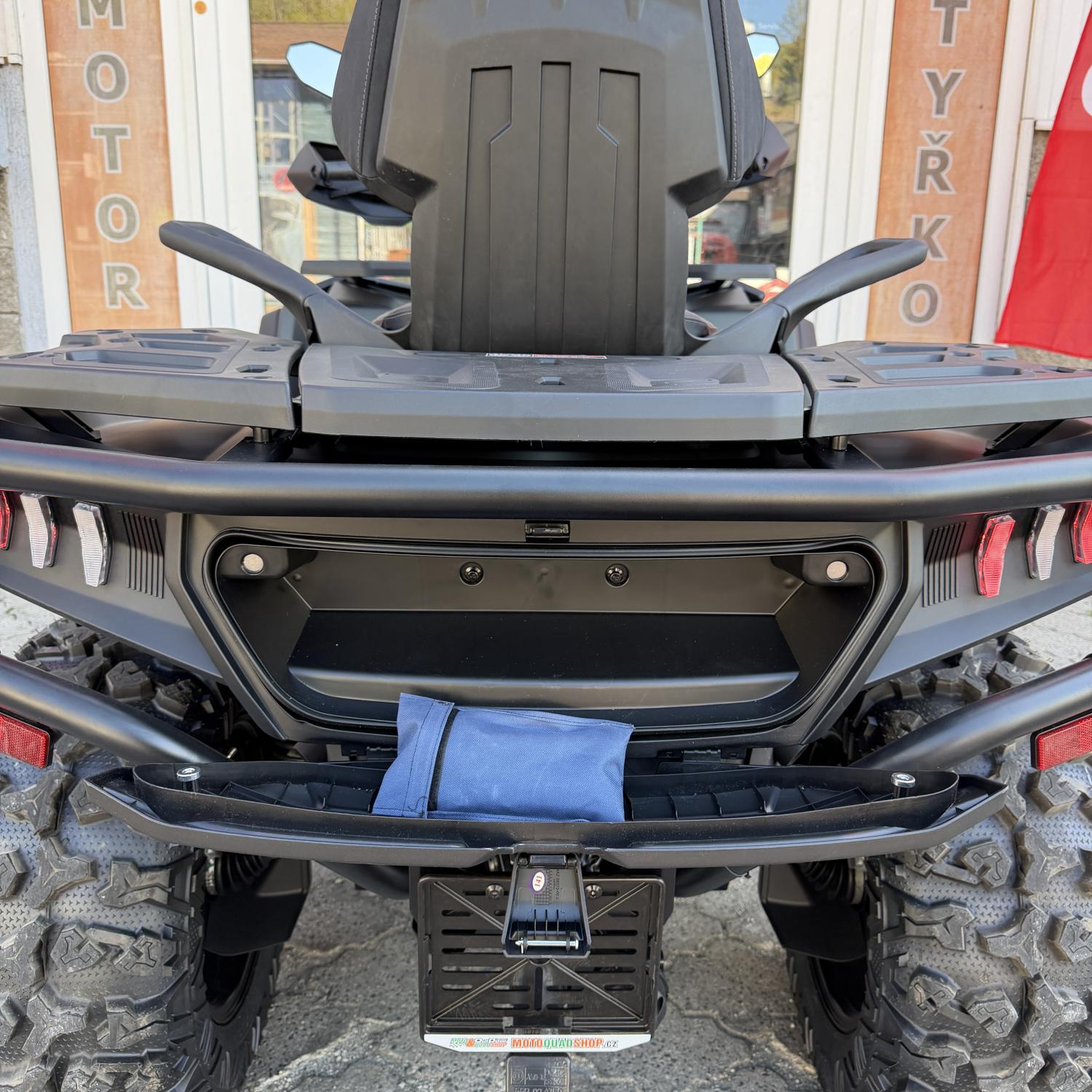 Elektrický naviják 3000lbs se sysntetickým lanem, elektrický posilovač řízení EPS, plně nastavitelné tlumiče s oddělenou nádobkou, homologované tažné zařízení, 14" designová ALU kola se systémem Beadlock, značkové 26" pneumatiky Bulldog, barevně odlišené masivní přední a zadní ocelové nárazníky, A-ramena a pružiny, hliníkové protiskluzové stupačky řidiče a spolujezdce, kompozitové nosiče vpředu a vzadu, kryty páček a rukou, Full-LED osvětlení, velký 7“ TFT displej, dvoubarevně prošívaná sedačka spolujezdce s opěrkou zad