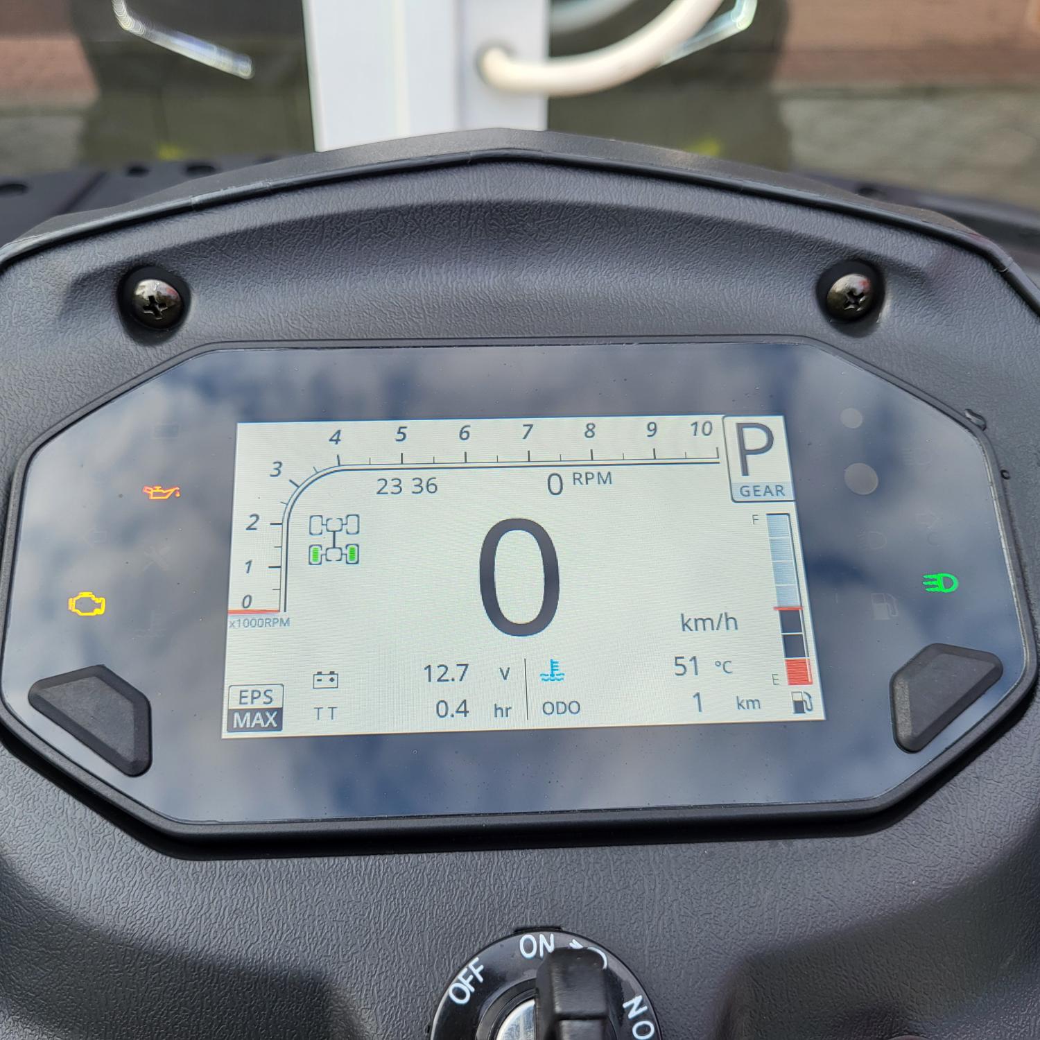 Nový barevný TFT displej s automatickým přepínáním denního a nočního režimu přehledně zobrazuje rychlost jízdy, digitální otáčkoměr, stav paliva, zařazený pohon 2WD / 4WD, režim posilovače, zařazený převod, teplotu chladicí kapaliny a denní počítadlo kilometrů. Displej navíc nově disponuje také Bluetooth připojením k mobilnímu telefonu a možností nastavení upozornění na nastavenou rychlost.